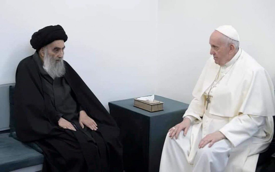 O aiatolá Ali al-Sistani afirmou ao papa Francisco, em reunião portas fechadas em Najaf, que os cristãos no Iraque deveriam viver em paz e com todos os direitos, durante encontro histórico entre o Vaticano e o Islã.
