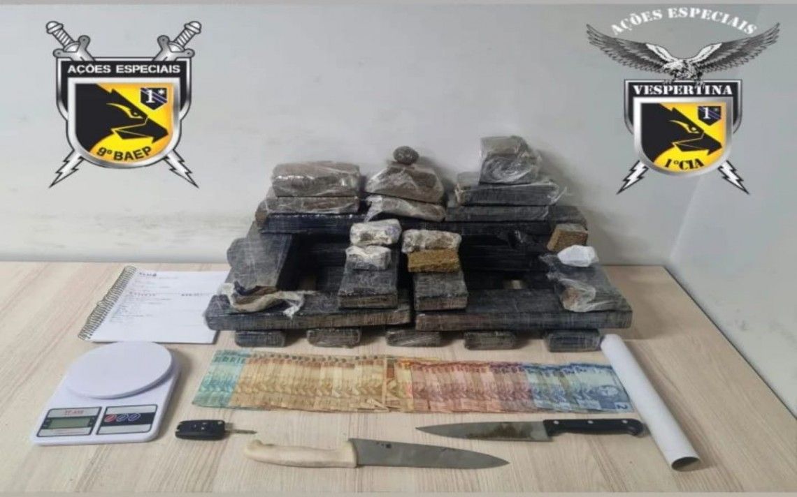 Questionado se tinha mais entorpecente em casa, ele disse que sim. Os policiais foram até o endereço no Residencial J. Macedo, e encontraram 14 tabletes de maconha, outras sete metades de tabletes da droga, seis porções menores, uma balança de precisão, duas facas com resquícios da droga e um caderno com anotações característica do tráfico.