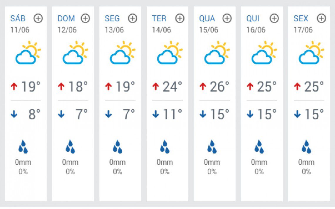 Ainda de acordo com o Clima Tempo, no decorrer da semana, as temperaturas apresentaram subiram ligeiramente e ficarão entre mínima de 15°C e máxima de 25°C. Neste perído não há previsão de chuvas.