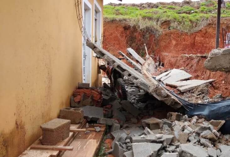O muro cedeu e acabou caindo, atingindo a casa ao lado do salão e abriu uma rachadura no banheiro e na sala ao lado, comprometendo toda a estrutura. Ainda segundo o empresário, foi preciso colocar escoras no teto para que a construção não caia também.