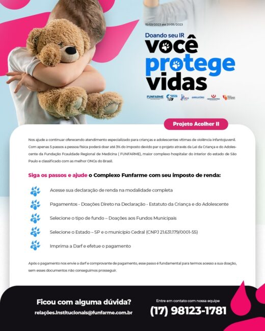 Segundo a Receita Federal, de todo o montante do imposto de renda no Brasil que pode ser revertido a projetos como os da Funfarme, somente 3% são destinados. É um percentual extremamente pequeno. E do valor do seu imposto de renda, o contribuinte pode destinar, na verdade, apenas um pequeno percentual, que varia de 1% a 6%. Além do Projeto Acolher, outras 5 iniciativas sociais da Funfarme também podem ser beneficiadas com a destinação solidária: