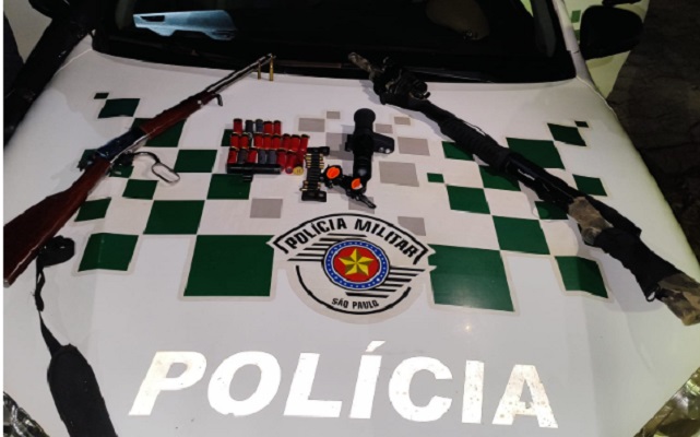 A equipe realizava fiscalização na região de uma lagoa e área de vegetação nativa quando viu um veículo em atitude suspeita. Na abordagem, os policiais encontraram com os ocupantes duas armas longas — uma carabina calibre .357 e uma espingarda calibre 12 equipada com luneta e mira a laser — além de munições de diversos calibres, um monóculo de visão noturna e outros itens usados em práticas de caça.