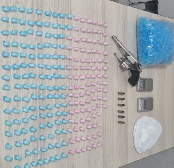 No imóvel, a equipe encontrou um revólver calibre 32 com numeração raspada e seis munições intactas, além de 192 microtubos de cocaína, uma sacola com o entorpecente a granel, um saco com tubos vazios e duas balanças de precisão.