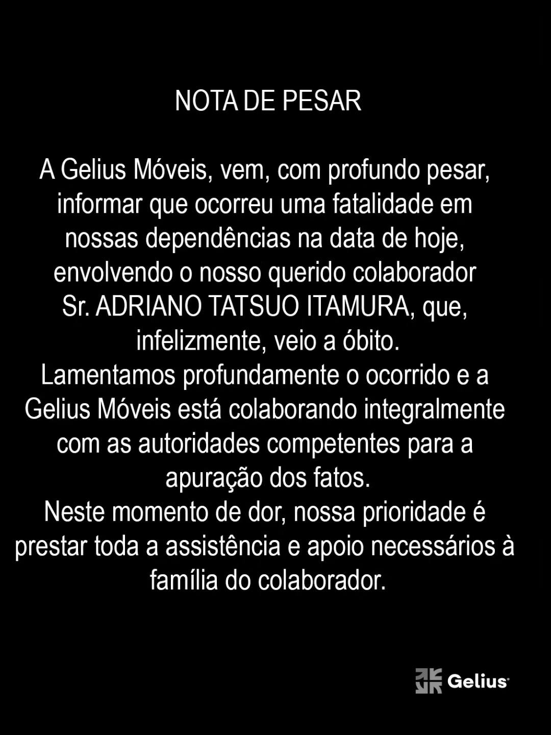A empresa Gélius também divulgou um comunicado oficial, no qual lamenta profundamente a fatalidade, informa que está colaborando com as autoridades e afirma que dará todo o suporte necessário à família.