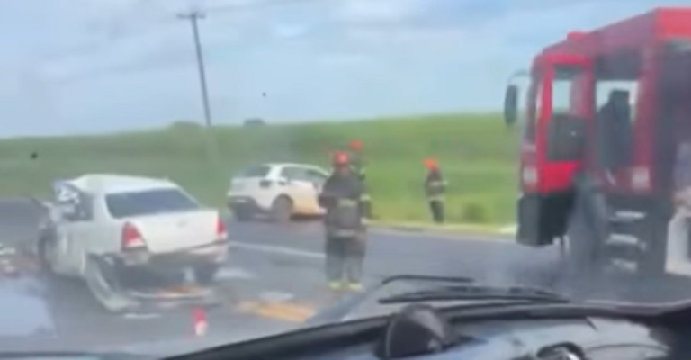 Acidente entre dois carros em trecho com faixa contínua deixou automóvel destruído