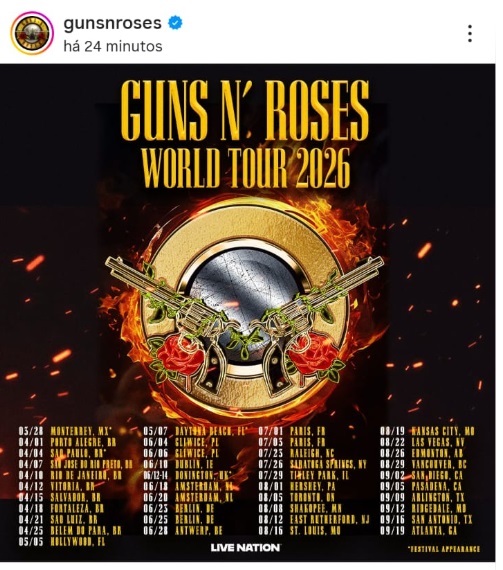 No Brasil, a World Tour 2026 da Guns N’ Roses terá início em 1º de abril, em Porto Alegre (RS). Para quem ainda não viu, a apresentação é um verdadeiro espetáculo.