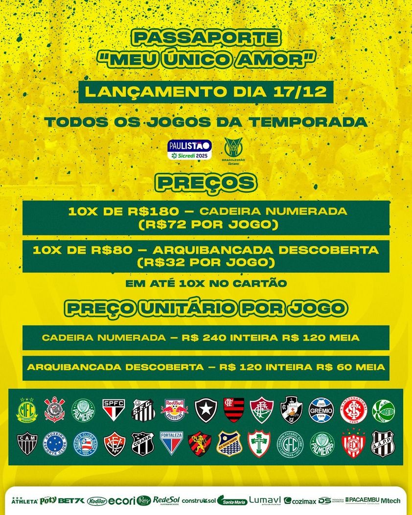 O Passaporte “Meu Único Amor” é uma oportunidade única para os apaixonados pelo Mirassol que desejam acompanhar de perto cada lance, cada vitória e o brilho do Leão no Maião. Além da economia, o torcedor terá prioridade de entrada, garantindo ainda mais comodidade e praticidade nos dias de jogos.