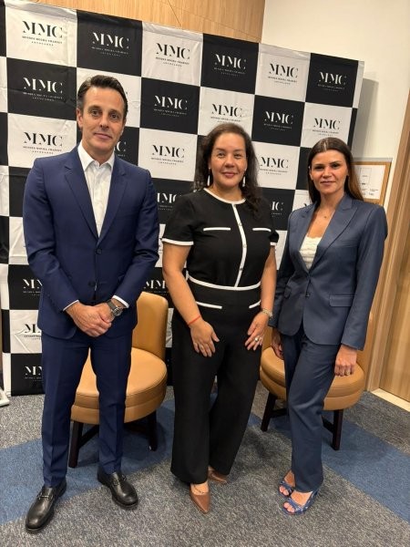 Os advogados Rafael Agostinelli Mendes, Luciana de Marco e Érika Moura, do escritório Mendes Moura Charnet Sociedade de Advogados, no evento em torno do meio médico que promoveram no Hilton Garden
