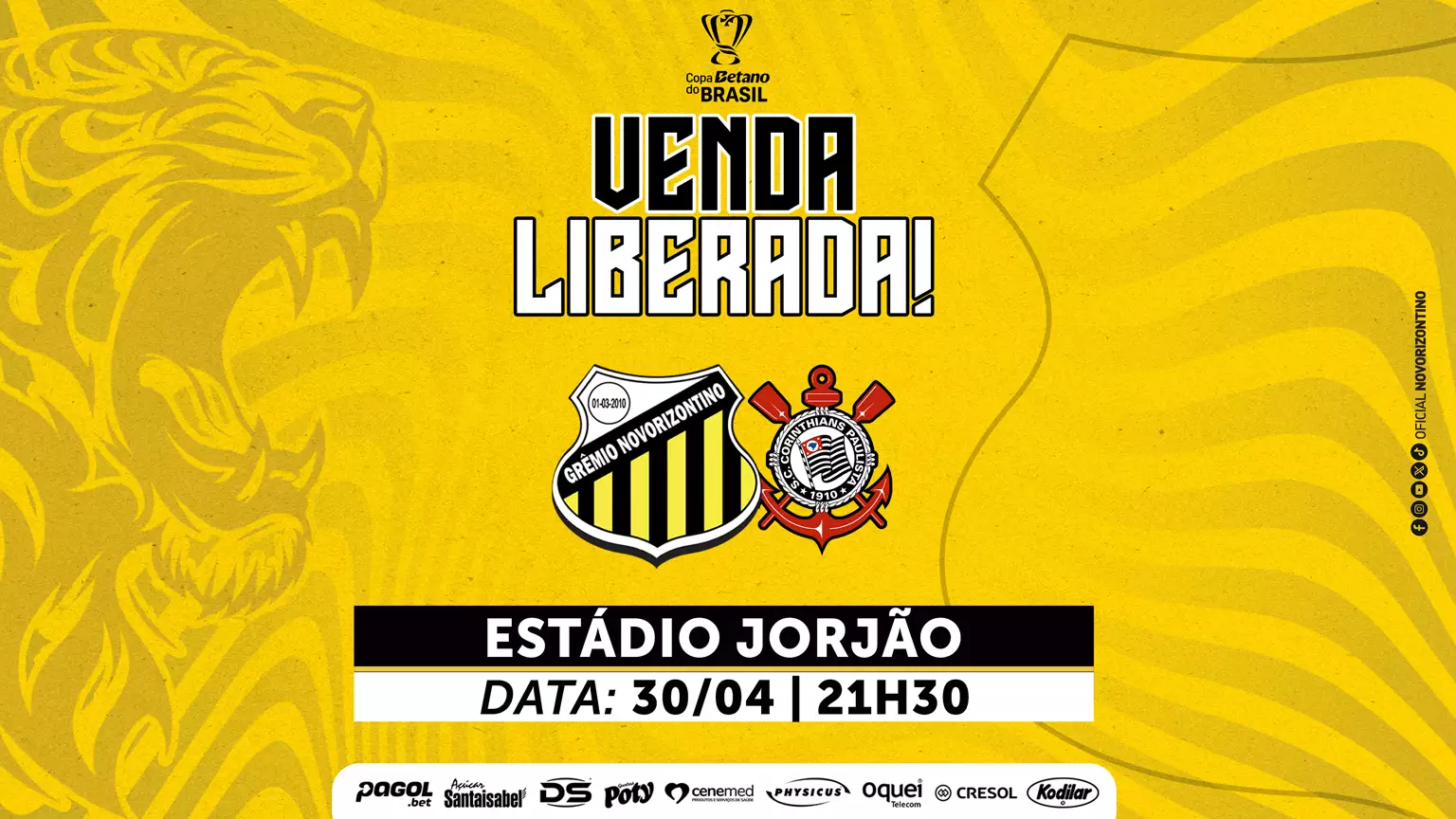 O Novorizontino iniciou as vendas on-line dos ingressos para o jogo contra o Corinthians, no próximo dia 30 de abril, quarta-feira, às 21h30, no Estádio Jorge Ismael de Biasi, em Novo Horizonte, na partida de ida da 3ª fase da Copa do Brasil.