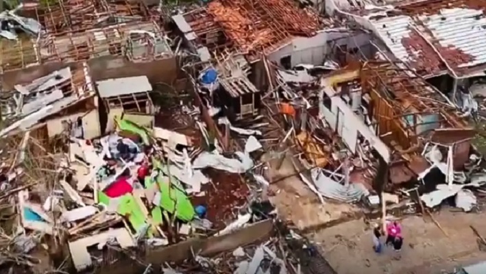 Imagens aéreas da cidade de Rio Bonito do Iguaçu, no Paraná, mostraram bairros inteiros destruídos pelo tornado que passou pela região Centro-Sul do estado. Dados da Defesa Civil apontam que 90% da área urbana de Rio Bonito do Iguaçu sofreram algum estrago na infraestrutura, seis pessoas morreram, duas estão desaparecidas e 432 estão feridas.