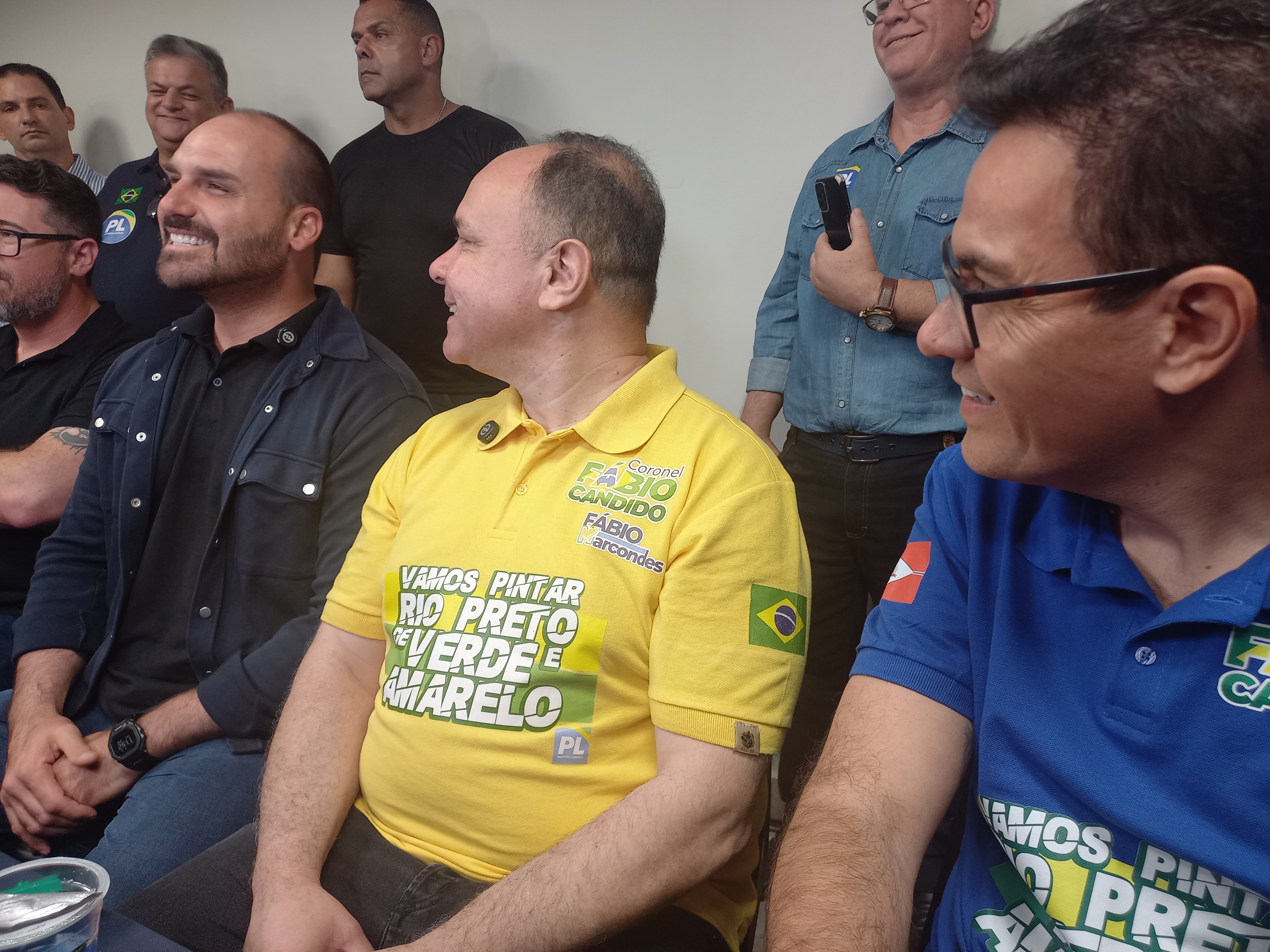 Para Eduardo Bolsonaro, o uso do nome do pai dele por partidos que não são de direita é uma forma de enganar os eleitores e que é normal o assédio de outras legendas para arrastar o PL para o palanque. “Bolsonaro teve 178 mil votos em Rio Preto, isso representa 73% dos rio-pretenses, e este é o peso dele na cidade. É complicado o filho do presidente dizer que apoia o Fábio Cândido e outros, que se dizem bolsonaristas, apoiarem outro candidato. É natural que muitos partidos busquem alianças com o PL. Vai ter coligações no país inteiro com centro-direita, direita e não tem problema nisso. É uma democracia”, afirmou.