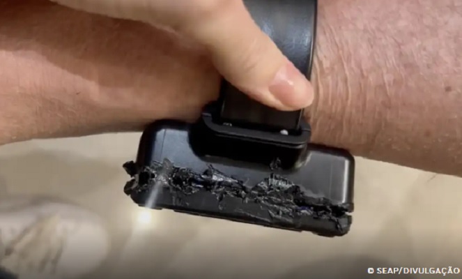 “O equipamento possuía sinais claros e importantes de avaria. Haviam marcas de queimadura em toda sua circunferência, no local de encaixe/fechamento do case. No momento da análise o monitorado foi questionado acerca do instrumento utilizado. Em resposta, informou que fez uso de ferro de solda para tentar abrir o equipamento”, diz o relatório.