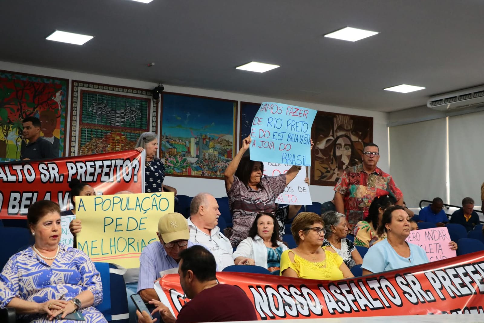 Moradores dos bairros Alvorada, Nossa Senhora Aparecida e Bela Vista I e II compareceram à sessão da Câmara de Rio Preto, nesta terça-feira (11), para protestar contra a falta de infraestrutura nas regiões recentemente regularizadas. Com faixas e cartazes, o grupo cobrou o cumprimento das promessas de campanha e chegou a vaiar e chamar o prefeito Fábio Candido (PL) de “safado” durante os debates no plenário.