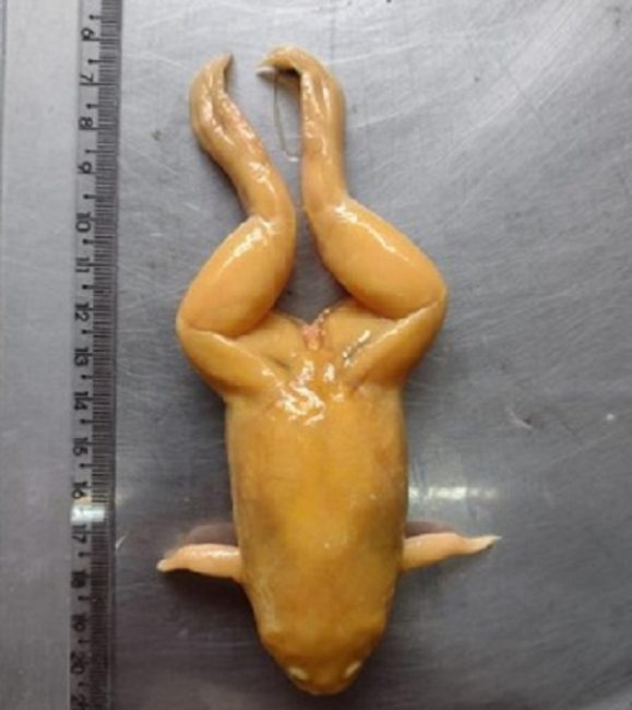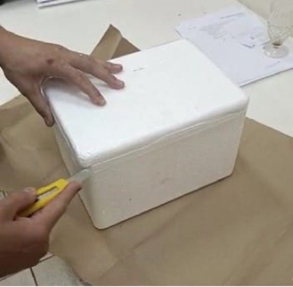 Ao abrir a embalagem, foram localizados dois pacotes plásticos, dentro de um deles, uma rã-de-garras-africana, da espécie Xenophus laevi, já sem vida, e uma salamandra ou axolote Ambystoma mexicanum, ambas espécies da fauna exótica.