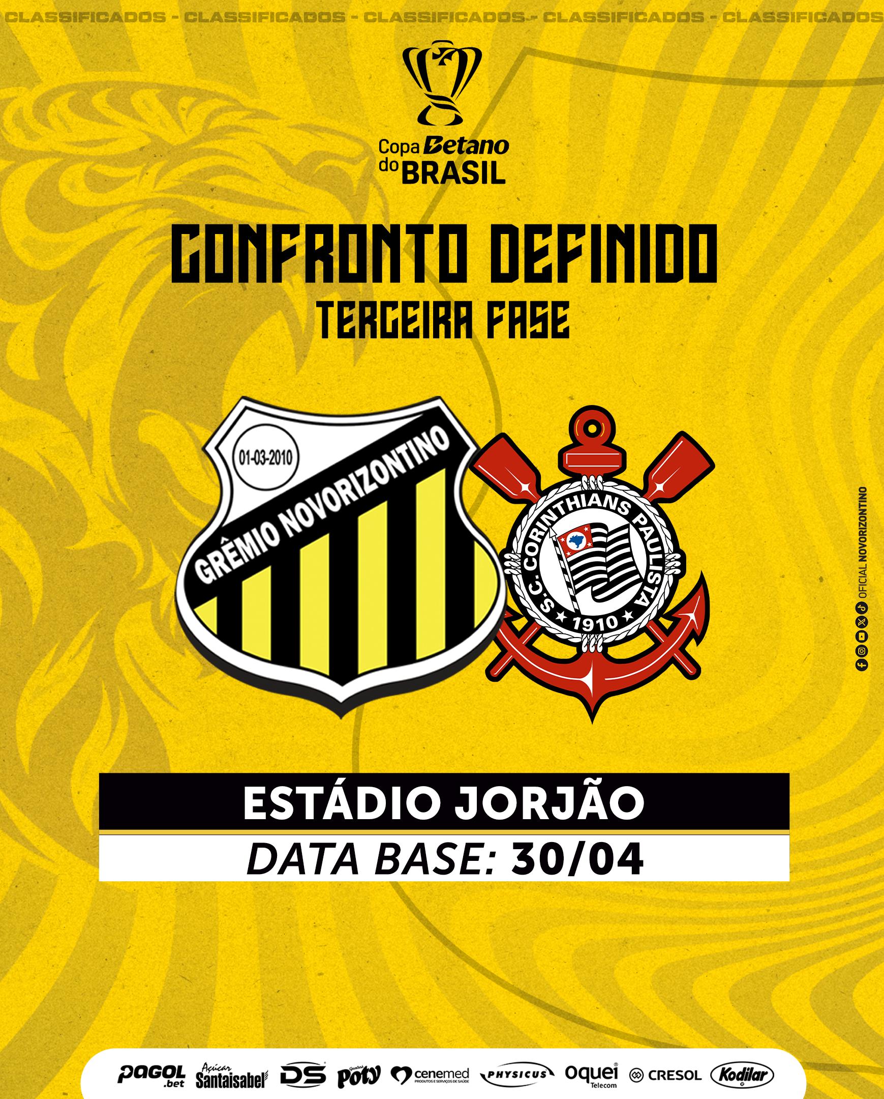 A CBF definiu essa semana os confrontos do Novorizontino pela terceira fase da Copa do Brasil. A equipe da região de Rio Preto enfrentará o Corinthians tendo como data base o dia 30/04, no estádio Jorjão, em Novo Horizonte, e o jogo de volta dia 21/05, em Itaquera.
